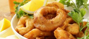 Grieks gebakken inktvis, citroen oliedressing, vissaus met rijst en koolsalade
